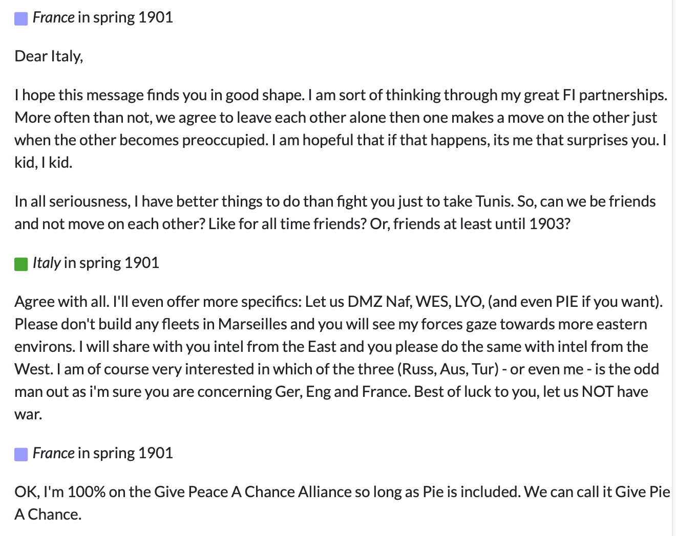 As for negotiations, I’m doing my normal bit, trying to find a friend. Germany and I seem to hit it off well. I go for my standard fare humor.