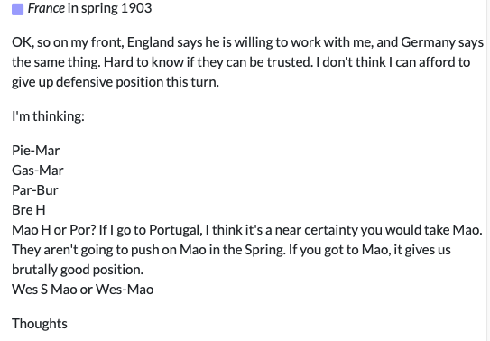 I just don’t trust England at all. Italy reaches out and wants an Italian, Russian, French alliance. Italy’s press is so long I don’t want to quote it, but to sum it up, he thinks we would be good friends, and he wants me to move to Iri or Nao and convoy to Liverpool. I’m lukewarm on that idea right now because, as part of that, he wants to take Spain. So, I push Italy to try and take Mao.