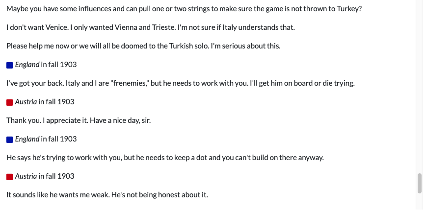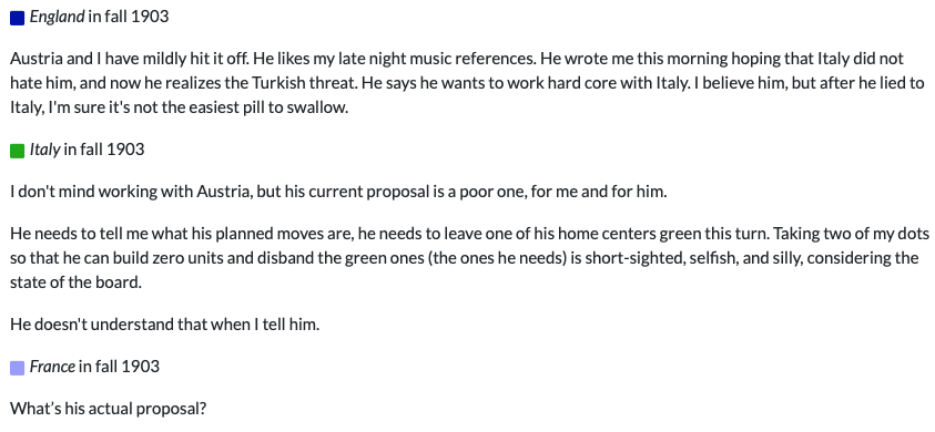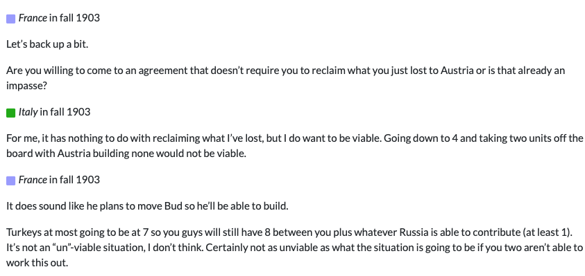 Italy sends out press to me, France, and Russia about his situation with Austria. I mostly include it for the high-level discussion between two great players, Italy and France (surely you did you think I was talking about myself?):