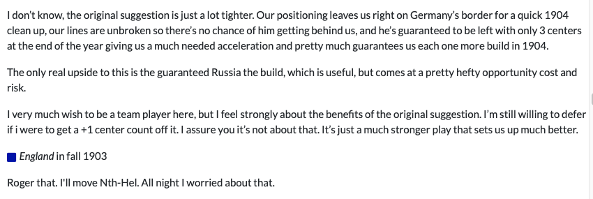 The Game Master delayed the finals four to five days because Germany quit. He is either upset or has suffered a real emergency. The timing suggests to me Germany is a baby. On the other hand, I find out he’s a moderator, and I just don’t think a moderator would quit. I haven’t spoken with him since Spring 1903 after the stab. Later, another player would float the idea that I caused @iosers (Germany 1) to drop out. Yes, I stabbed, but I had no press to him that taunted him or anything like that. The dude had barely been around for a few days.[1]