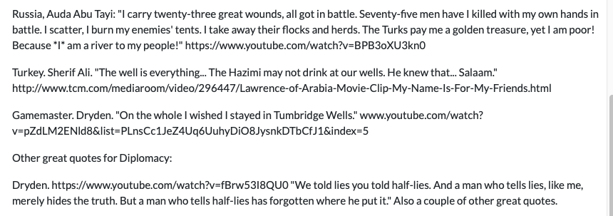 One of the things I’m doing here is building a relationship with Austria. There are three players (1) France @Villageidiot; (2) Turkey @Umble; and(3) Italy @Conq, who are only going to let you go so far in terms of personal bonding. France and Turkey always have their guard up. Everything is about the game or said in mind with the game. @Conq and I like to joke around a bit and try to one-up each other. Russia, @Magnesiumfire was funny, but I know now—but did not know at this moment in time—that our age difference is such that it would be hard for an old guy like me to bond with him well. He did like Springsteen, though, and that’s a positive. Germany and I were barely speaking, even though I was allied with him for a turn.