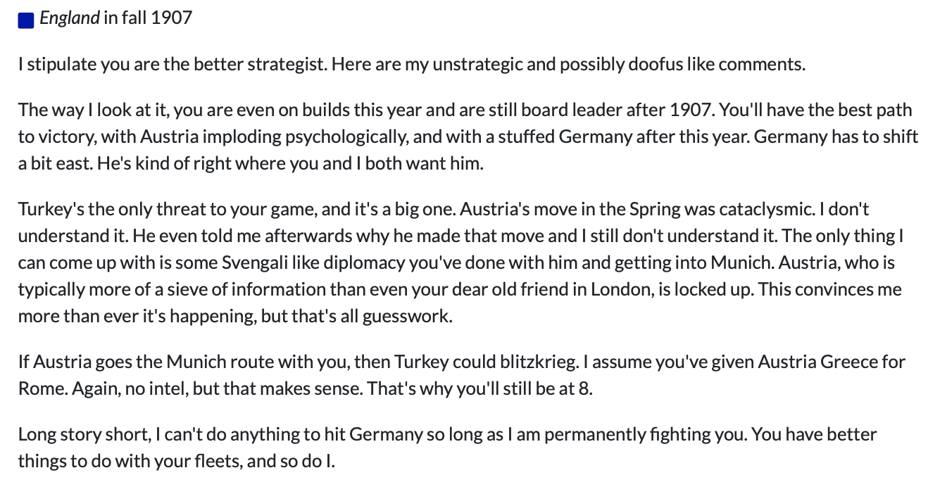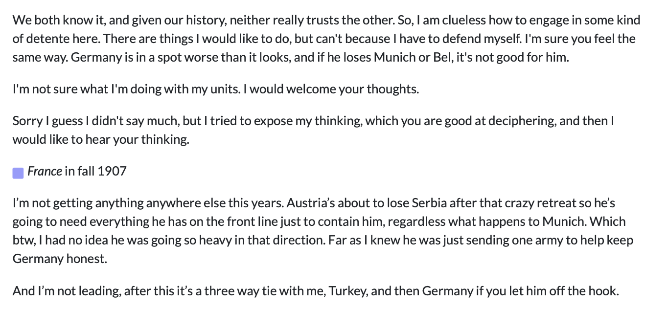 We have a little more time than normal due to the powers entering retreats more quickly than normal. Austria retreated to Galicia, continuing his attack against Germany. Austria’s move made very little sense to either Germany or myself, so we decide to work on Austria. I reached out to Austria to make sure he is okay. Discussed in Chapter 20. I also tell him what he needs to hear.
