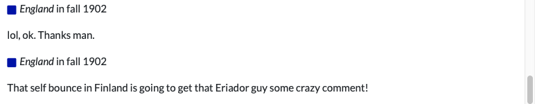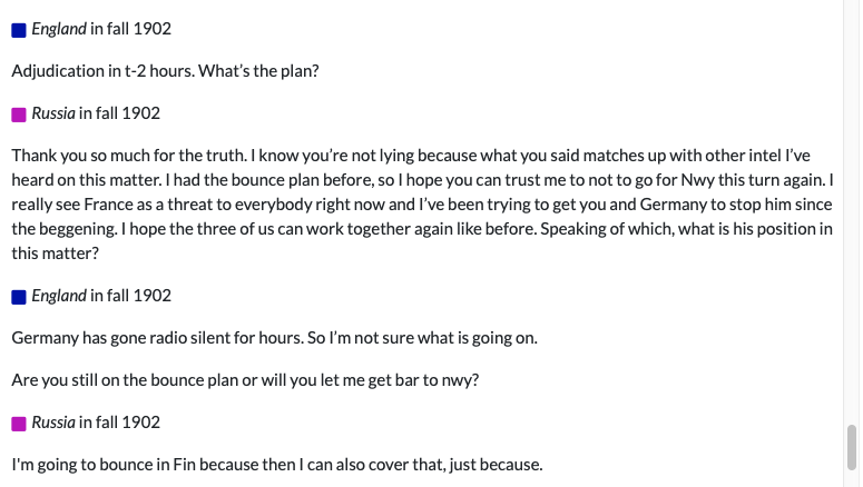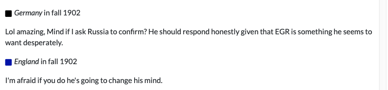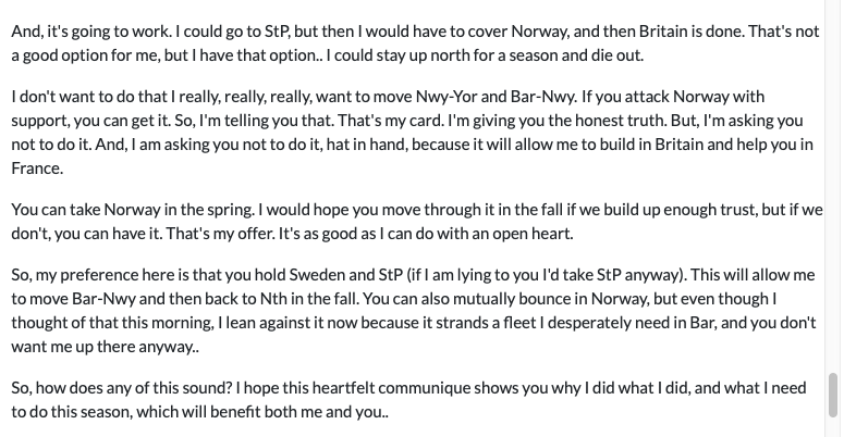 It’s like a scene out of a Hitchcock movie or something. I’m in a trance, and then I start to see some openings. I think I can sell EG to Germany and help against both Russia and France. I try to connect with Germany. He seemed game before, and I am hopeful for an alliance, so I send press to him to try and build trust.
